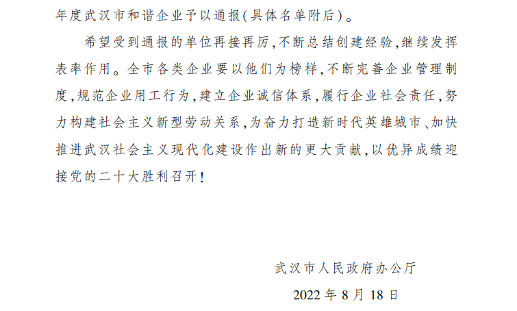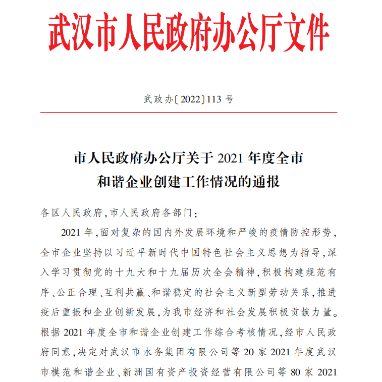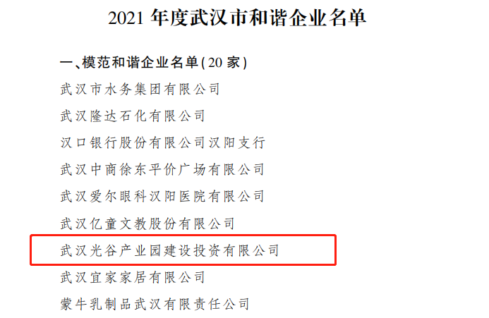 近日,武漢市人民政府辦公廳發(fā)布了《2021年度全市和諧企業(yè)創(chuàng)建工作情況的通報(bào)》,武漢光谷產(chǎn)業(yè)園建設(shè)投資有限公司繼榮獲武漢市和諧企業(yè)、職工心靈加油站稱(chēng)號(hào)后,獲評(píng)“2021年度武漢市模范和諧企業(yè)”榮譽(yù)稱(chēng)號(hào)。